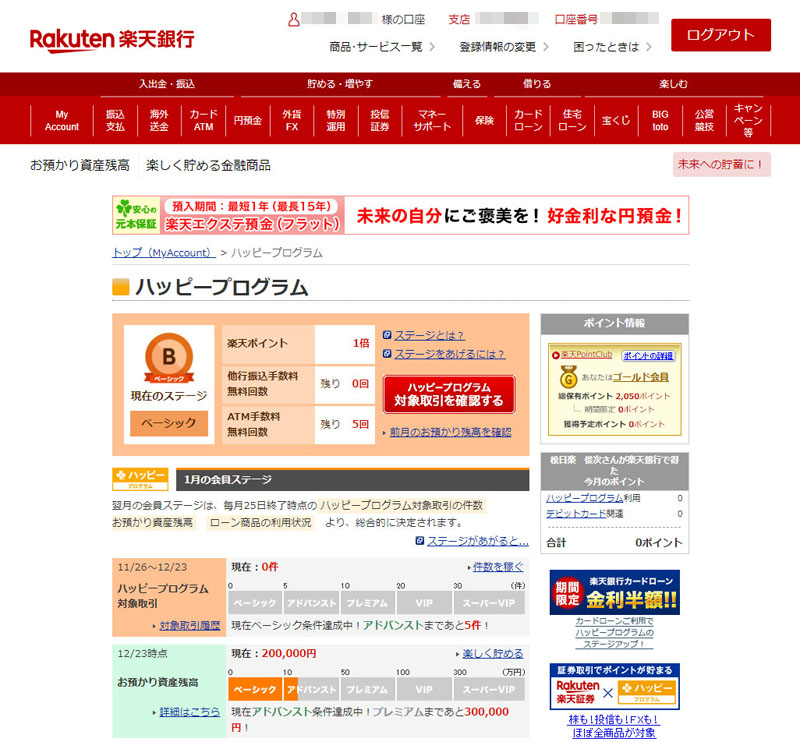 楽天銀行にログイン後 My Account>ハッピープログラム で確認できます