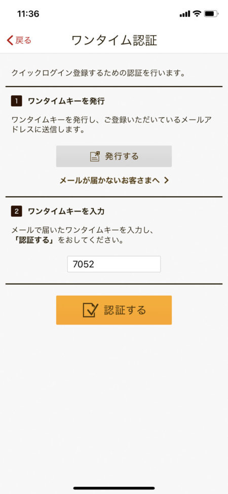 が送信されますので記載の「ワンタイムキー」を入力して「認証する」をタップ