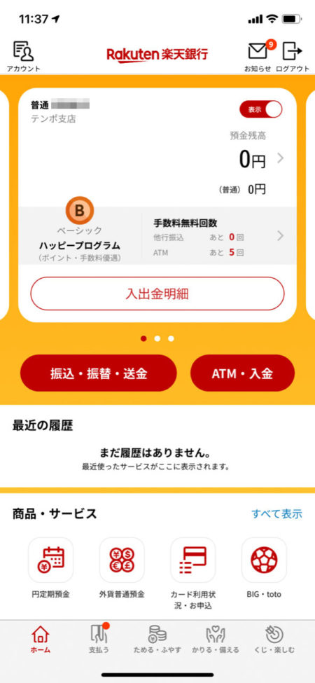 「楽天銀行アプリ」を立ち上げます。