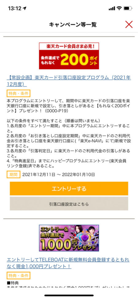 続いては「楽天カード引落口座設定プログラム(2021年12月度)」にエントリーします。