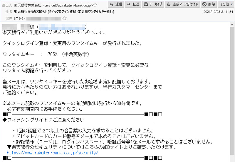 件名:楽天銀行からのお知らせ[クイックログイン登録・変更用ワンタイムキー発行]