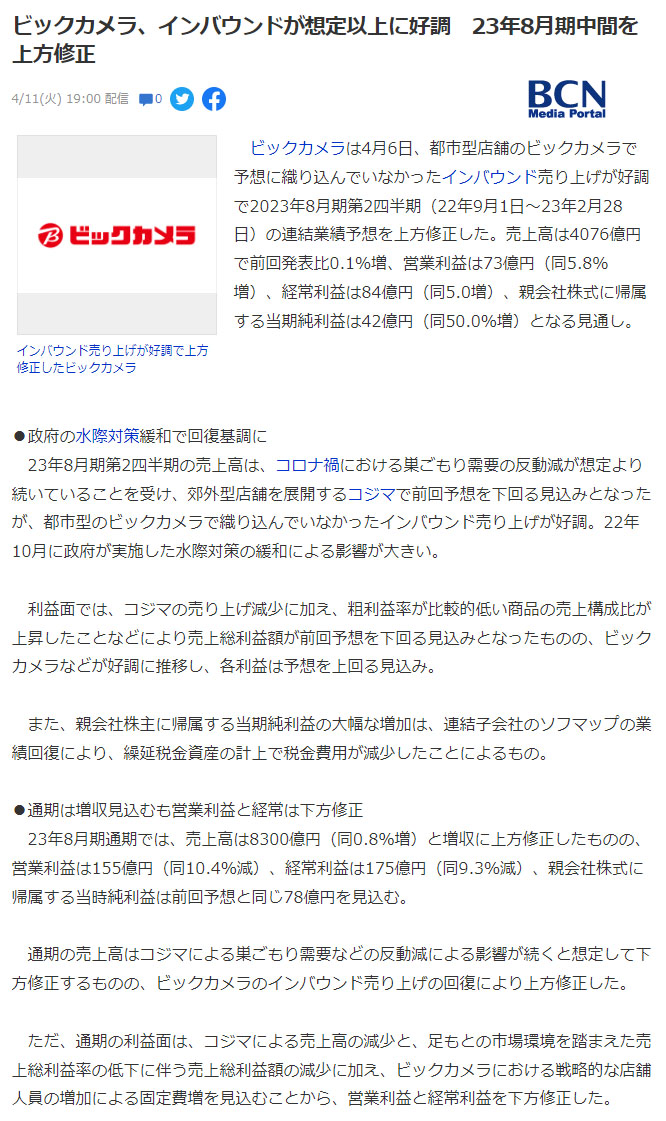 ビックカメラ2023年8月期第2四半期決算 ビックカメラはインバンド需要で売り上げ増 コジマは巣ごもり需要の反動で売り上げ減 通期では増収減益に下方修正 まぁ何れにしてもコロナ前には戻らないと思う。 確かにインバウンドを取り込むことも大事だが別の収益を得るかじ取りも必要かと? 店舗社員の増員で固定費上がるようだけどインバウンド目当てだとそれほど戦略的とは思えない。