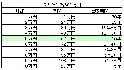 仮に月々5万円の積み立てだと年間60万円で10年で使い切ります。これなら可能な範囲だし、現行の「つみたてNISA」とほぼ同じような考え。20年の積立が10年になる感じ。私の場合は10年ぐらいが丁度良い期間です。(もうジジイなので)