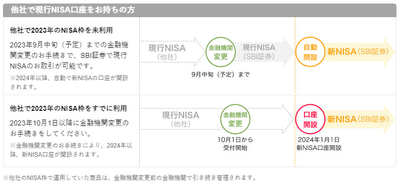 私は2023年はすでに楽天でNISA枠を利用しているので移管するとしたら10月からの手続きとなります。ちなみに過去2年間の「つみたてNISA」はそのまま楽天証券管理になります。勿論SBIにまるごと移すのも可能。