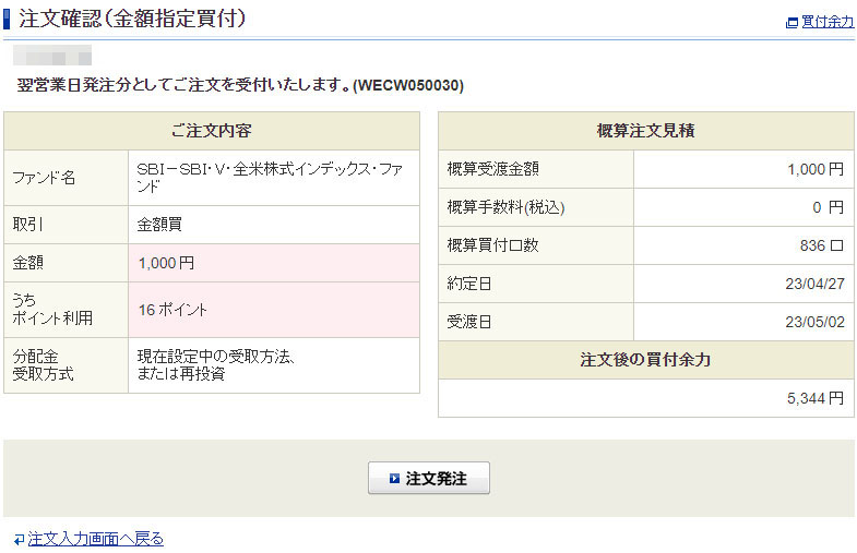 Vポイントが入ったのでSBI・V・全米株式インデックスファンドを1,000円分追加|2023.4.25 何時ものようにVポイントが入ったのでSBI・V・全米株式インデックスファンドに1,000円分を入れます。今回は「5月請求分のカード利用分」です。このところVISAカードを使ってなかったので得たポイントは僅か32ポイントでした。 半分の16ポイントを「SBI・V・全米株式インデックスファンド」で使います。 口座からの持ち出しは984円です。 今日は火曜日なのでGW前には約定するようです! 前述しましたがこのところ買い物を控えているので久しぶりのVポイントでしたw