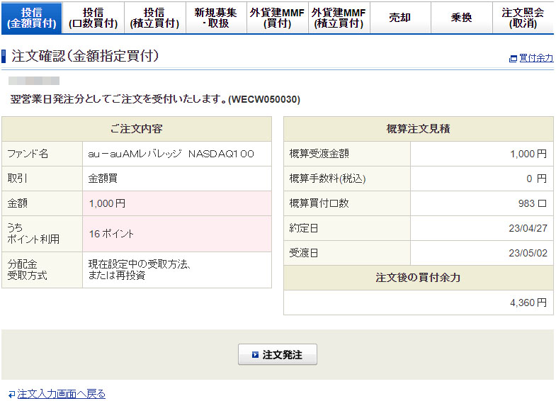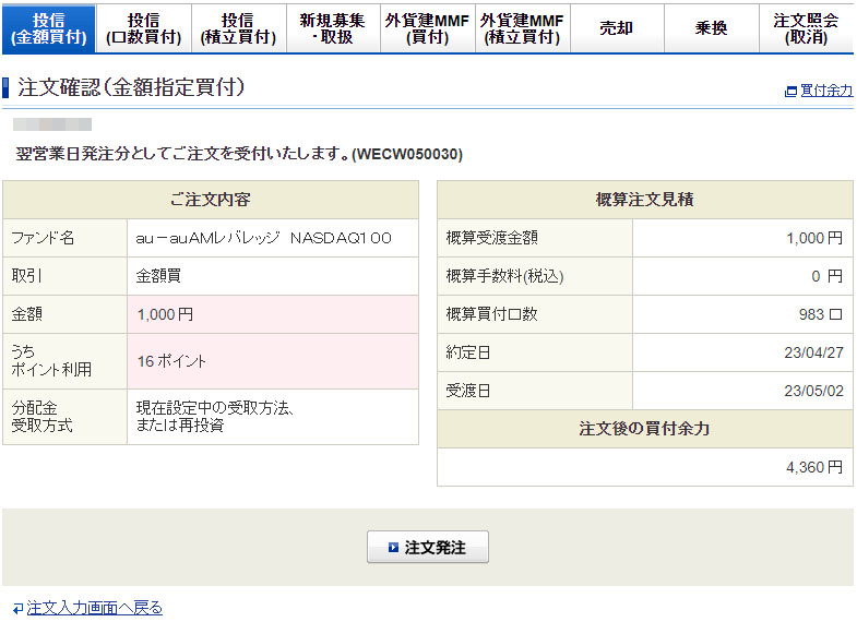 Vポイントが入ったのでauAMレバレッジNASDAQ100を1,000円分追加|2023.4.25 続いて、auAMレバレッジNASDAQ100にも1,000円分 残り16ポイントを「すべて利用する」で入金! こちらも持ち出しは984円になります。 こちらも27日の約定予定。 最近はNASDAQ100もレンジ相場であまり動きはありません。明日からの大型テック(GAFAM)の決算次第でしょうか?大きく下げたら追加したいのですが、投信なので指値が出来ないのがもどかしいw