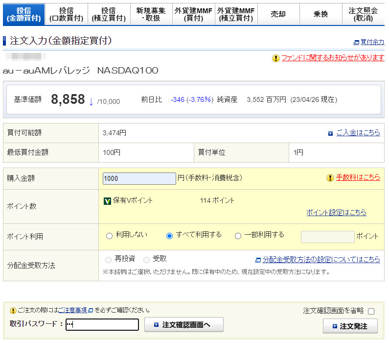 Vポイントが入ったのでauAMレバレッジNASDAQ100を1,000円分追加|2023.4.27 そして半分を「auAMレバレッジNASDAQ100」へ1,000円分にして投入! 114ポイントを「すべて利用する」 同じく口座からの持ち出しは886円となります。 約定日は4月28日です。(今日の朝だったので翌営業日)