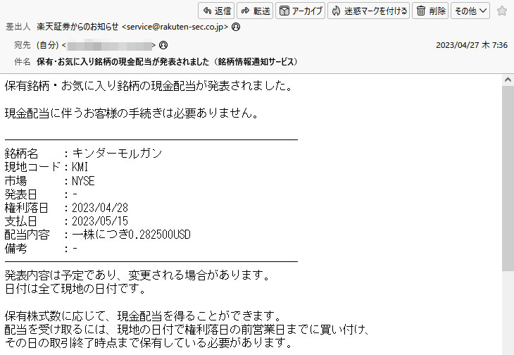 キンダー・モルガンの配当のお知らせが楽天証券からメールで来ました!