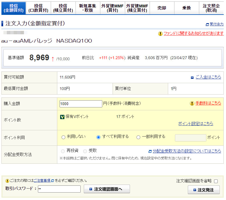 Vポイントが入ったのでauAMレバレッジNASDAQ100を1,000円分追加|2023.4.28