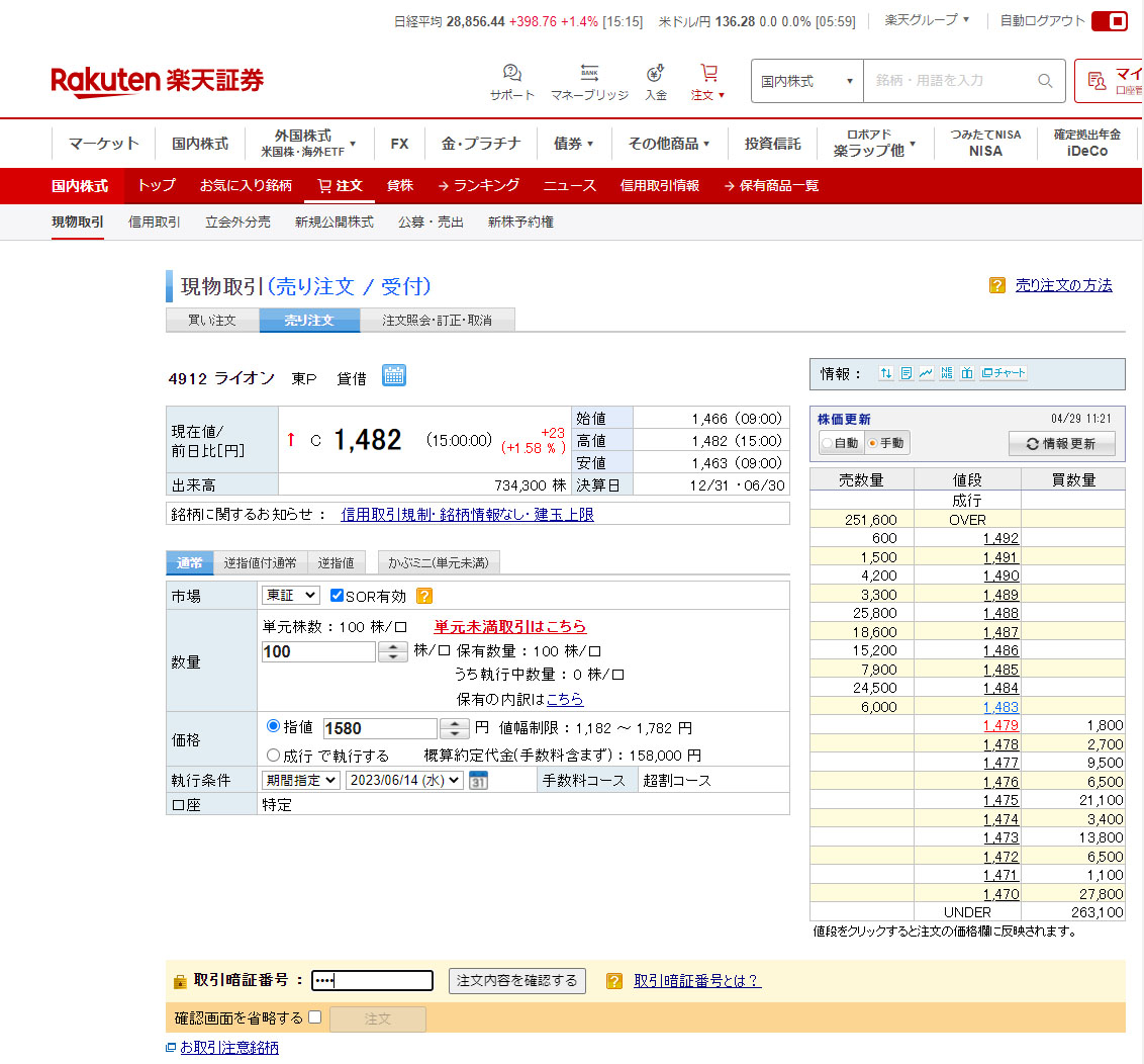 ライオン(4912)売り注文