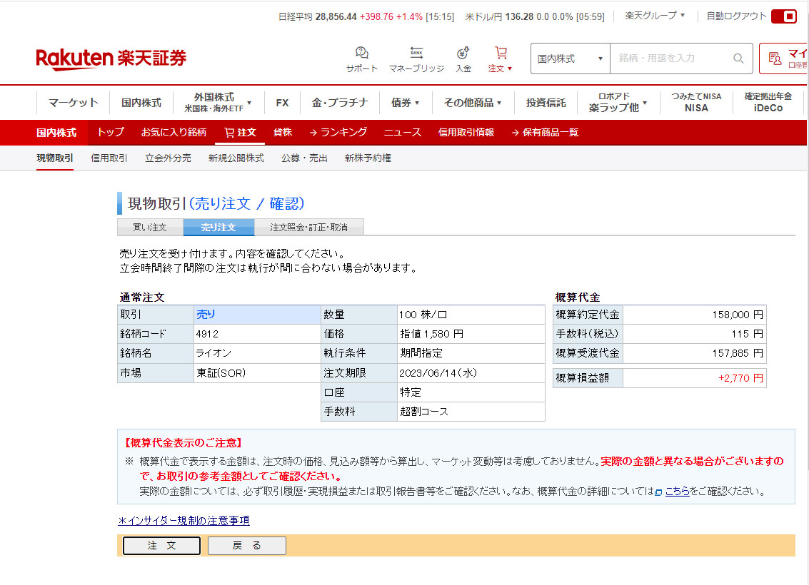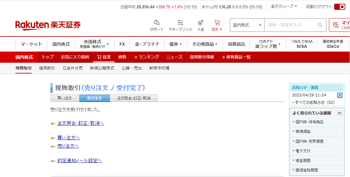 とは言っても損切は嫌なので、利が乗った値での指値売り注文を入れました。