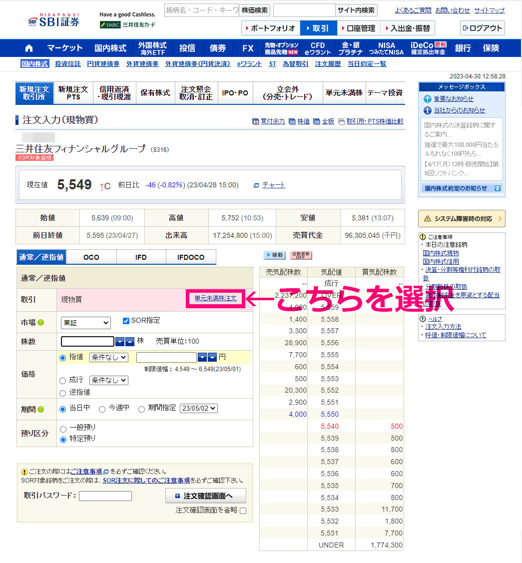 すると単元未満株専用?のページになり