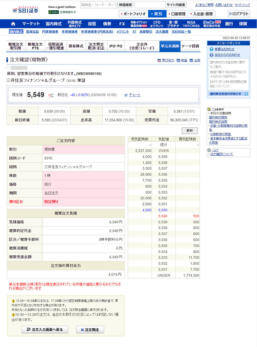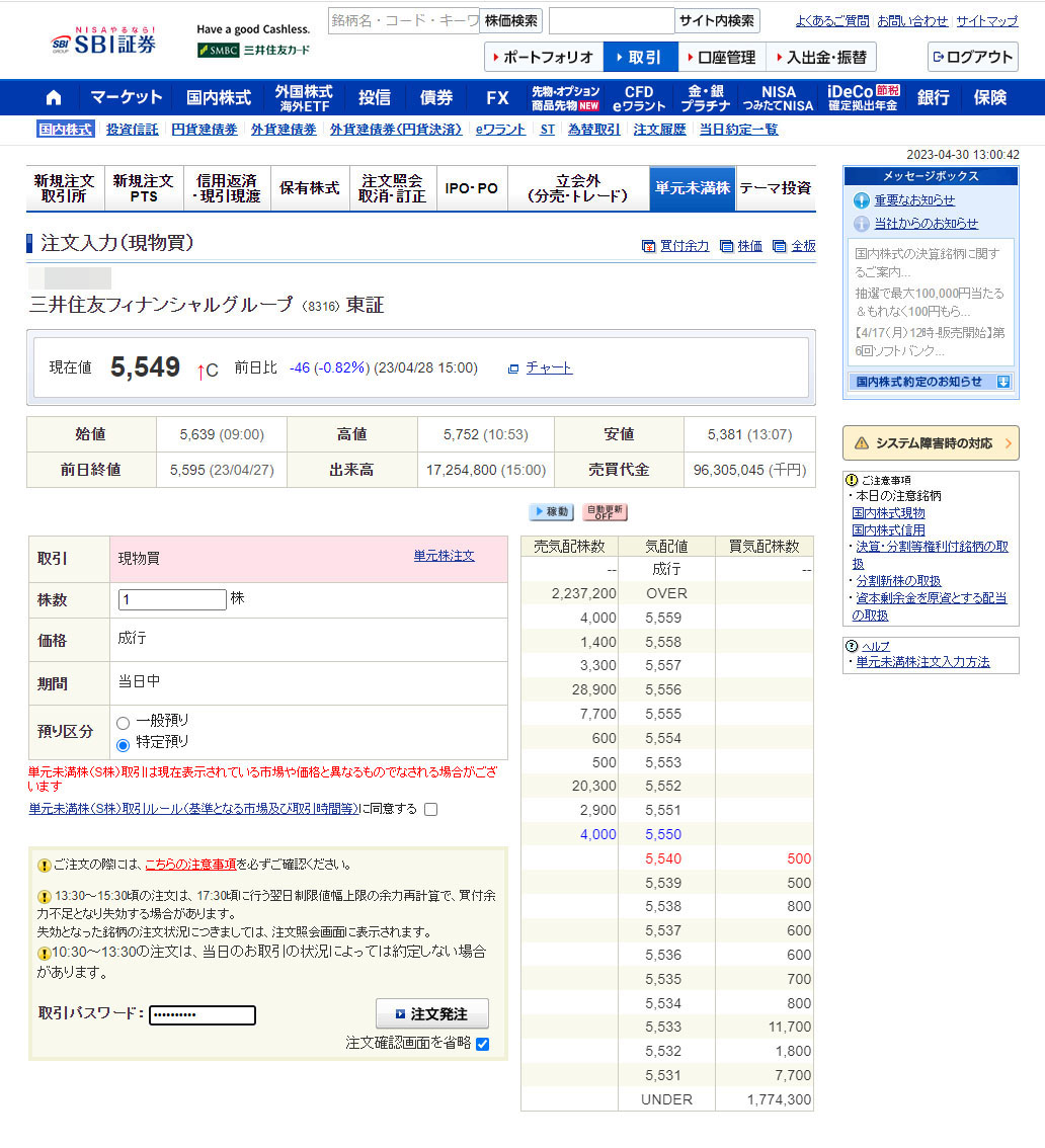 まずはリストの上からで三菱UFJフィナンシャルGは楽天口座にあるので「三井住友フィナンシャルグループ」をチョイス!今の価格は5,549円