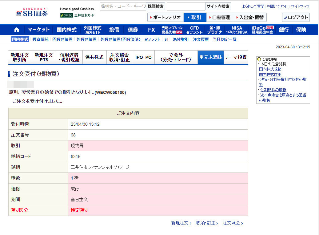 なので幾らで購入できるかは現時点では分かりません。楽天証券だとリアルタイムで出来るみたいなのでSBI証券もその内改善されるんじゃないかな?