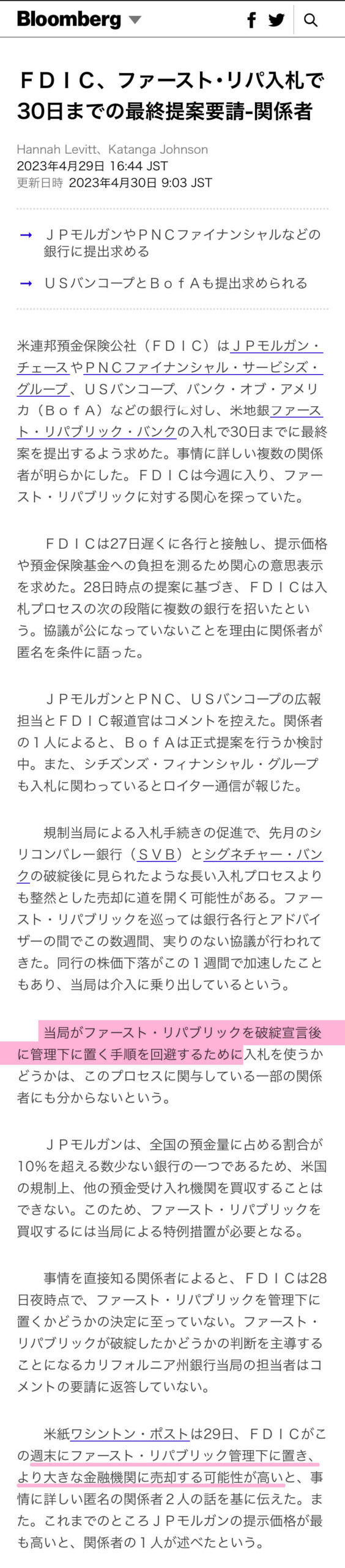 続 ファースト・リパブリック・バンク その後の報道 今日の夕方、ブルームバーグにニュースが出ていました。 今のところまだどうなるかははっきりしていないようです。 何とか破綻だけは避けてもらいたいけど・・・。 仮に買収されるとしたらスイスの「クレディスイス」のように受け皿の銀行の株式に置き換えられて生かされる?って事もアリ??? 何れにしてももう全て溶けたと思ってた方が精神安定的にもイイですね・・・9万は痛いけど。