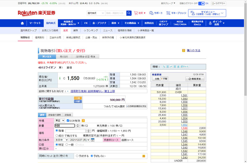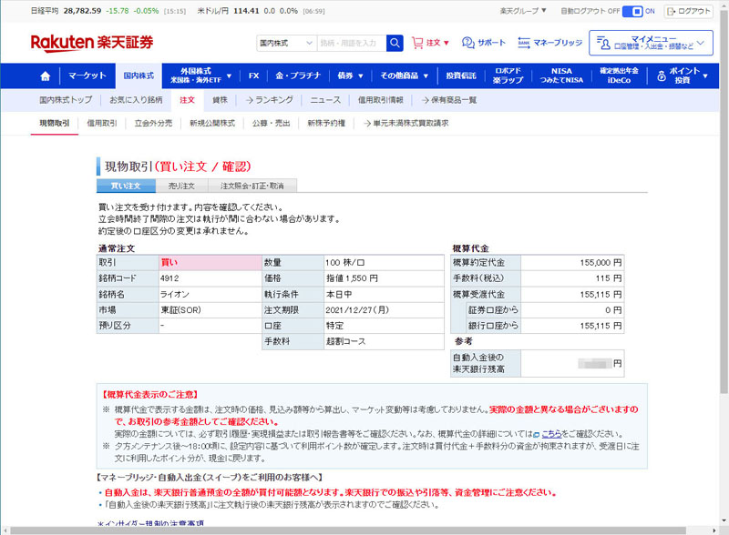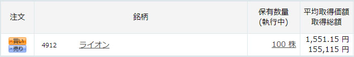 ライオンは100株155,115円で購入