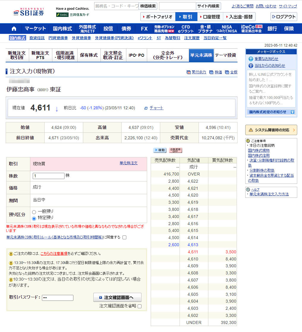 ※SBI証券は単元未満株の取引は「成行」でしか出来ません。「▶注文発注」をポチっ