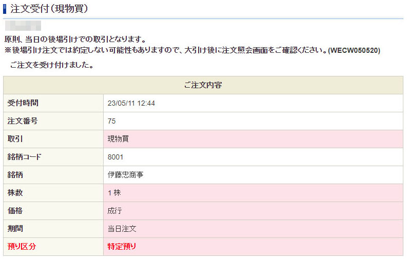 現在、お昼休みなので後場の寄り付きで約定する予定です。成行なので。