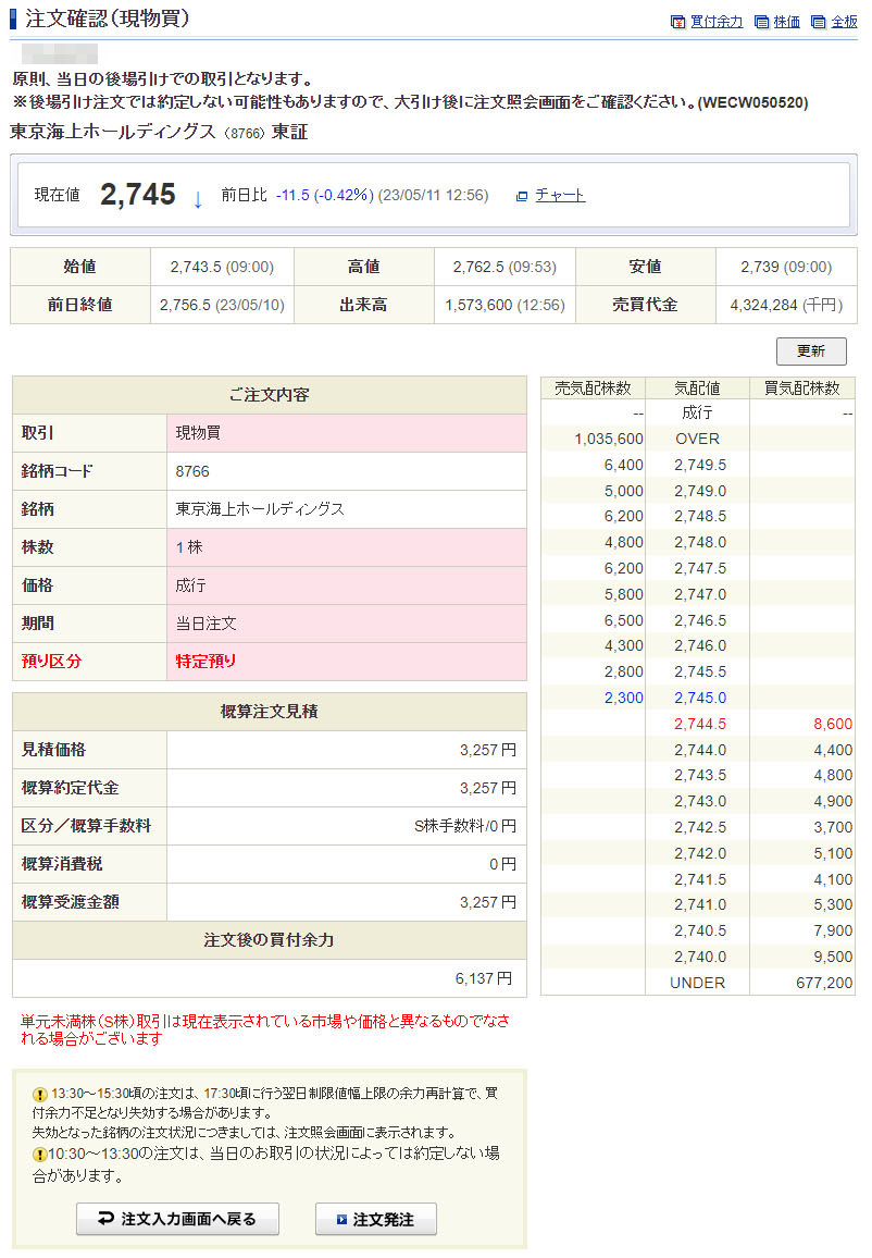 「伊藤忠商事」「積水ハウス」と1株ずつ買ってもまだ10,000円には満たないのでもう1銘柄を物色!こちらも前日比で下げていた「東京海上ホールディングス」に決めました。