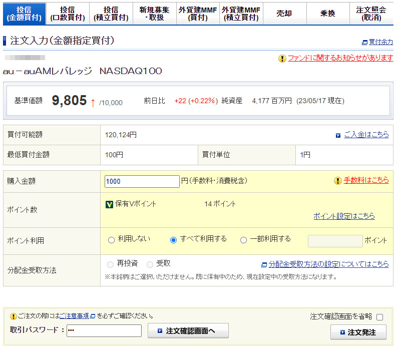 Vポイントが入ったのでauAMレバレッジNASDAQ100を1,000円分追加|2023.5.18 そして半分は「auAMレバレッジNASDAQ100」へ、やはり1,000円分 残り「すべて利用する」で こちらも口座からの持ち出しは986円 レバナスについても定期です。 実際、NASDAQ100ってS&P495以外w みないなモノですよね? 大幅に寄与してるのはGAFAMとNVIDIA、TESLAですから。Fは落ち目ですがw だったらレバナスに投資するのは正道だと思うのですよ。お金持ちならQQQでも良いかもしれませんが信託報酬もたいして変わらないし、やはりレバの方が貧乏人には夢があります。まぁ~さすがに全突っ込みはないですがwww