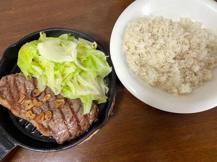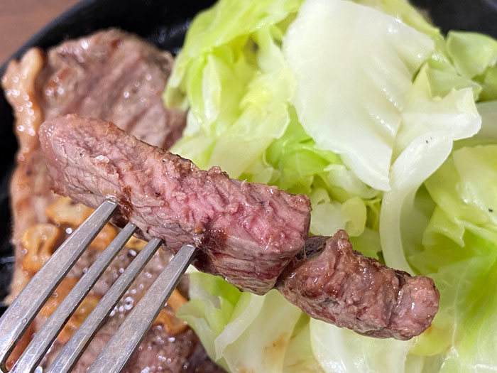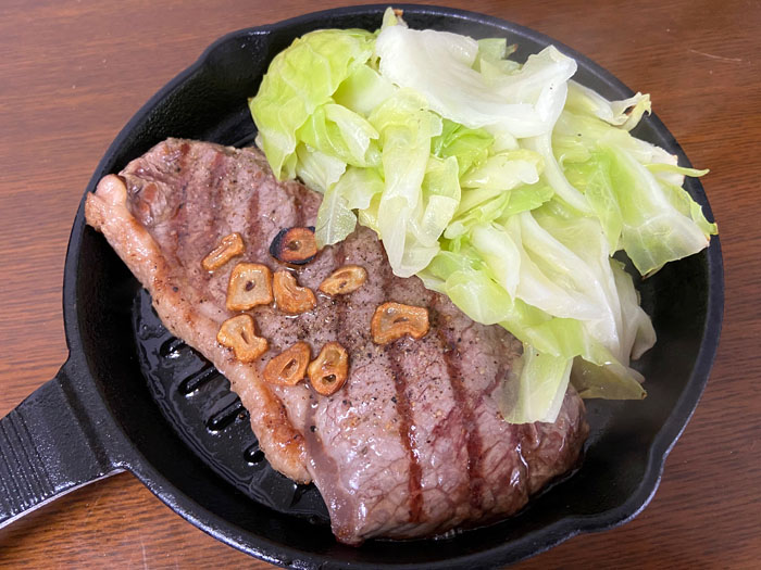 やはり少し焼すぎかな?ミディアムぐらいでした。鉄鍋は冷めにくいですが火の入りが早く意外と焼くのが難しい。。。