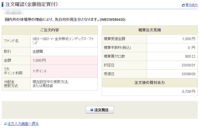 Vポイントが入ったのでSBI・V・全米株式インデックスファンドを1,000円分追加|2023.5.28 前回の続き 投信マイレージ4月分の2ポイントが入ったので何時ものルーティーンでw まずは「SBI・V・全米株式インデックスファンド」に1ポイントを使い1,000円分 口座からの持ち出しは999円です。ほとんど現金ですねwww 今日は28日の日曜日なので月曜扱いで31日(水曜日)の約定???あれ?やはり中一ですね もう良く分かりませんがw