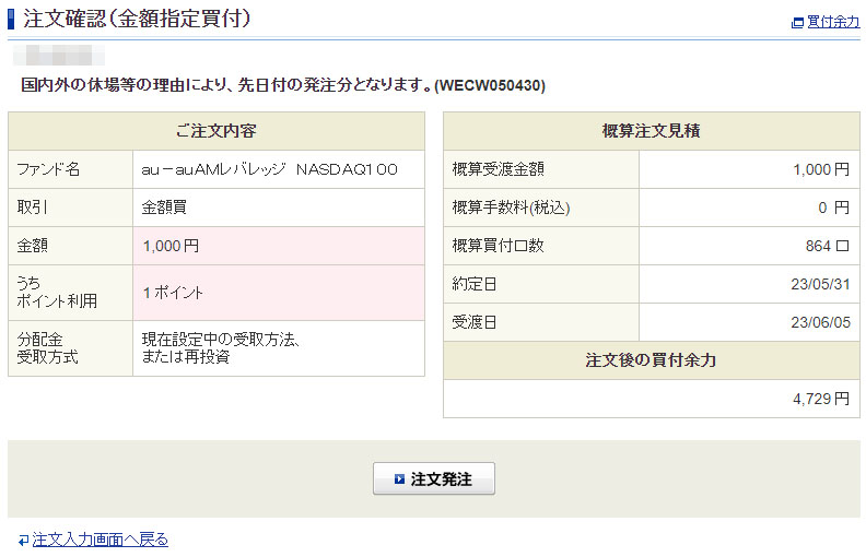 Vポイントが入ったのでauAMレバレッジNASDAQ100を1,000円分追加|2023.5.28 そしてこちらも 「auAMレバレッジNASDAQ100」も同様に1ポイント使って1,000円分の入金 現金999円です。 正直、クレカ積み立てでした方がポイントが溜まるので効率はイイのですが、このコツコツ感も気に入っていて持続感がやる気に繋がりモチベーション維持になります。 まぁ~小額ですし年内は続けます。