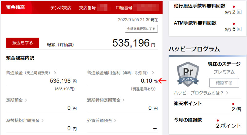 楽天銀行にログインして確認しました。ちなみに預金50万円にして「プレミアム」にしています。