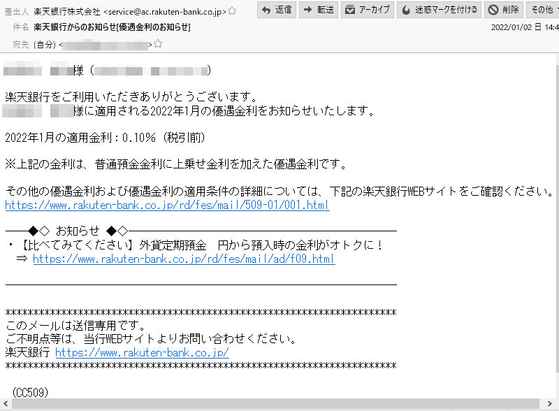 件名:楽天銀行からのお知らせ[優遇金利のお知らせ]が来ました。