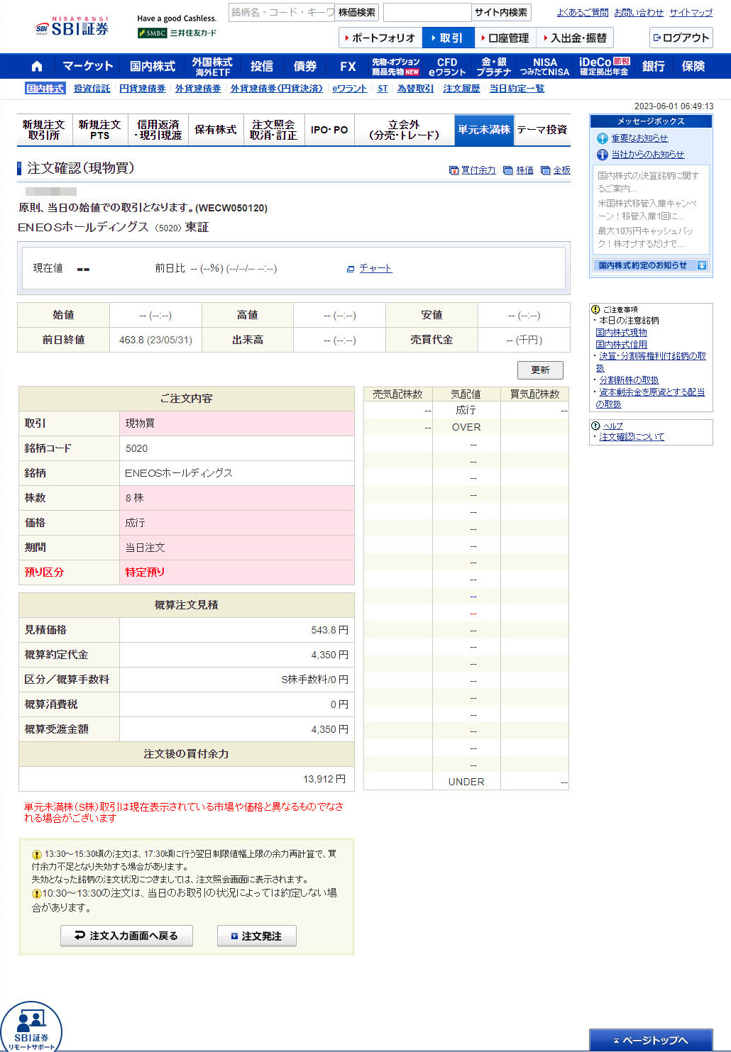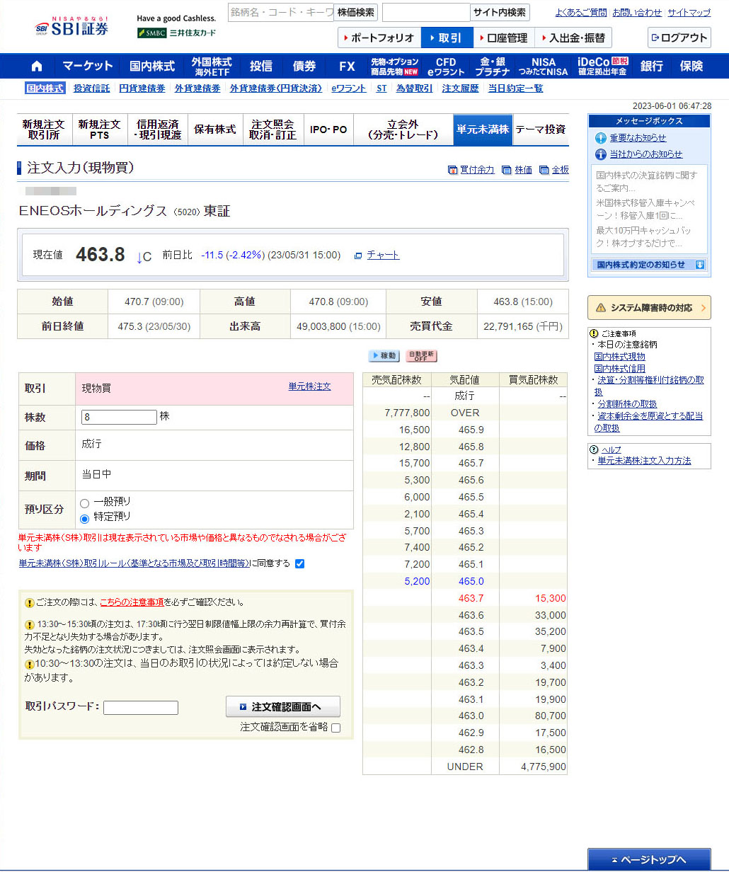 ENEOSホールディングス(5020)を8株追加 今日最後は原油が下がって株価も下がった「ENEOSホールディングス」を購入。 まだ下がりそうな気配ですが・・・。 単価が安価なので切よく手持ちが10株になるように8株にしました。 こちらも朝一の寄り付きで約定予定です。 「原則、当日の始値での取引となります。」と記載があります。 462.3円で約定しました。前回は471.5円で2株購入していますのでこれで平均取得単価を下げる事になります。 今日の購入は3銘柄で12,765円。月初早々ですが今月も下限1万円でのノルマ達成でマイルールである10,000円ベースでの購入完了です。まだ6月はじまったばかりなので月末までにはまだ何か手を付けるかも?