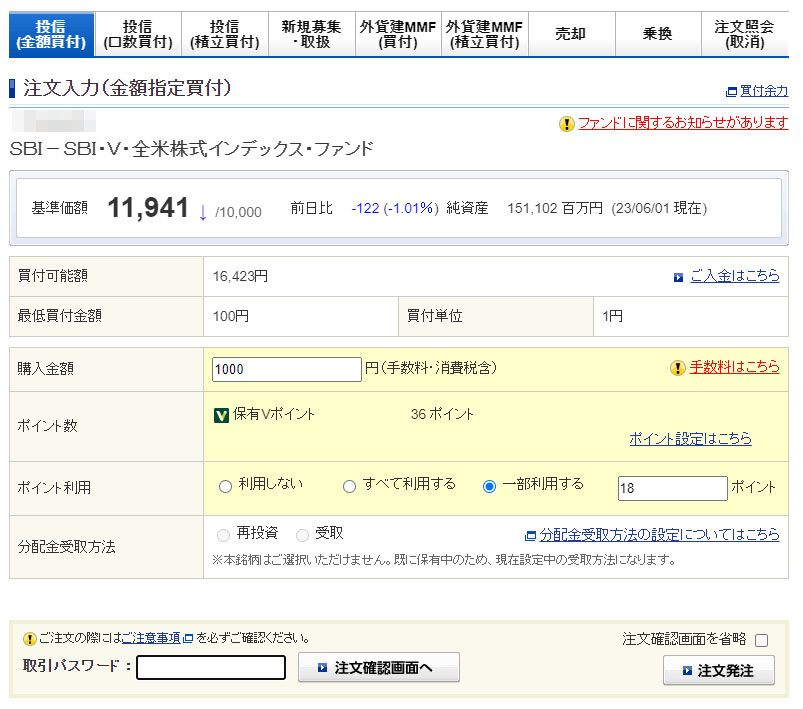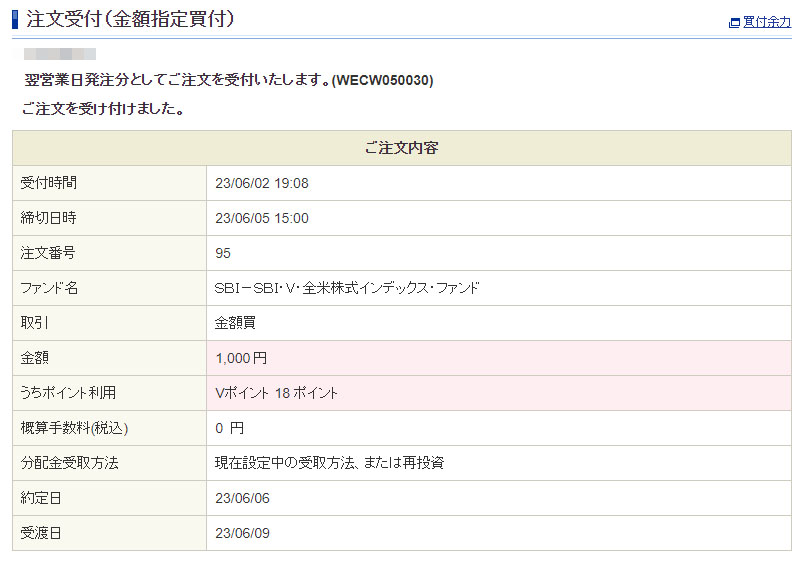 Vポイントが入ったのでSBI・V・全米株式インデックスファンドを1,000円分追加|2023.6.2 5月のタッチ決済分のVポイントが入りました。 先月は各種税金の支払いがあったので極力買い物はしなかったので僅か36ポイントです。 そして何時ものヤツで「SBI・V・全米株式インデックスファンド」 半分の18ポイントを使ったので持ち出しは982円です。