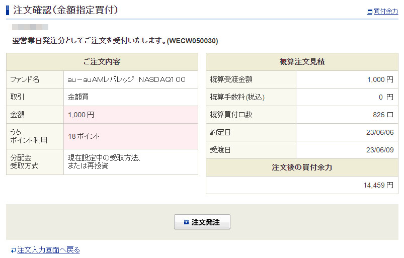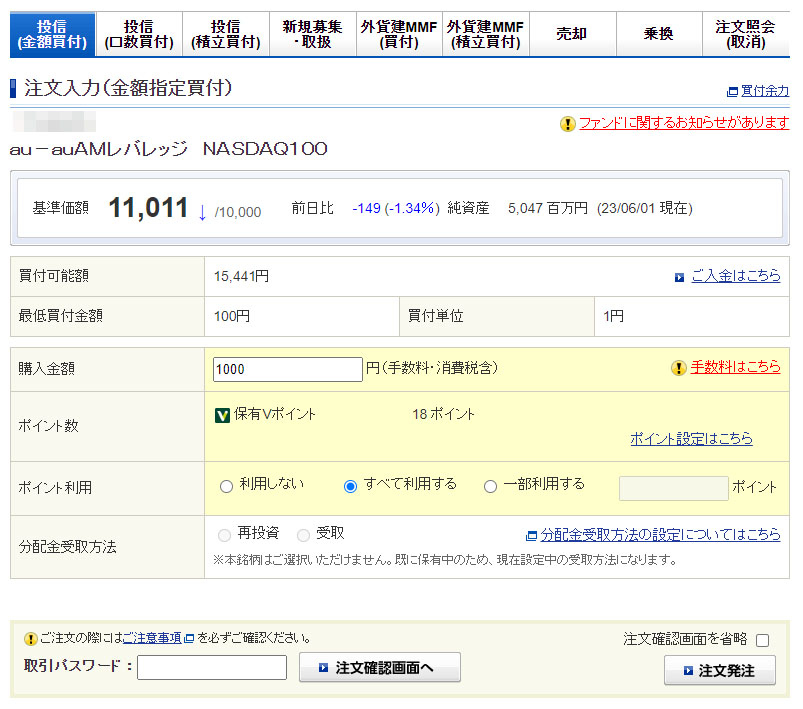 Vポイントが入ったのでauAMレバレッジNASDAQ100を1,000円分追加|2023.6.2