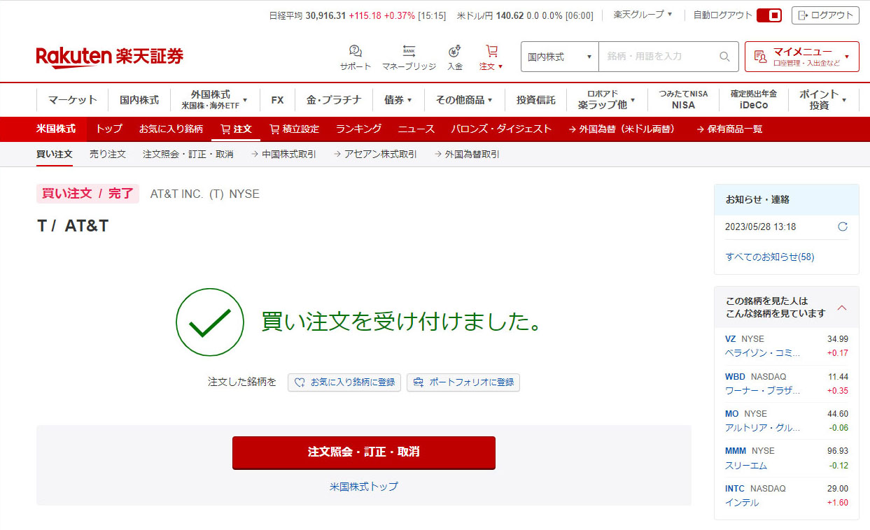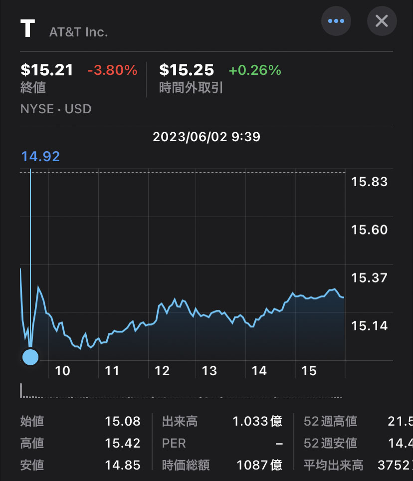 先週の日曜日(5月28日)に指値で注文を入れていたAT&Tが約定。