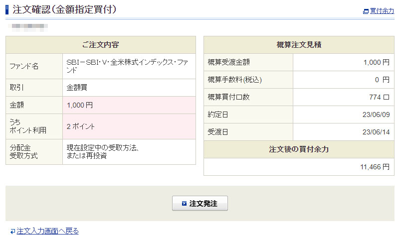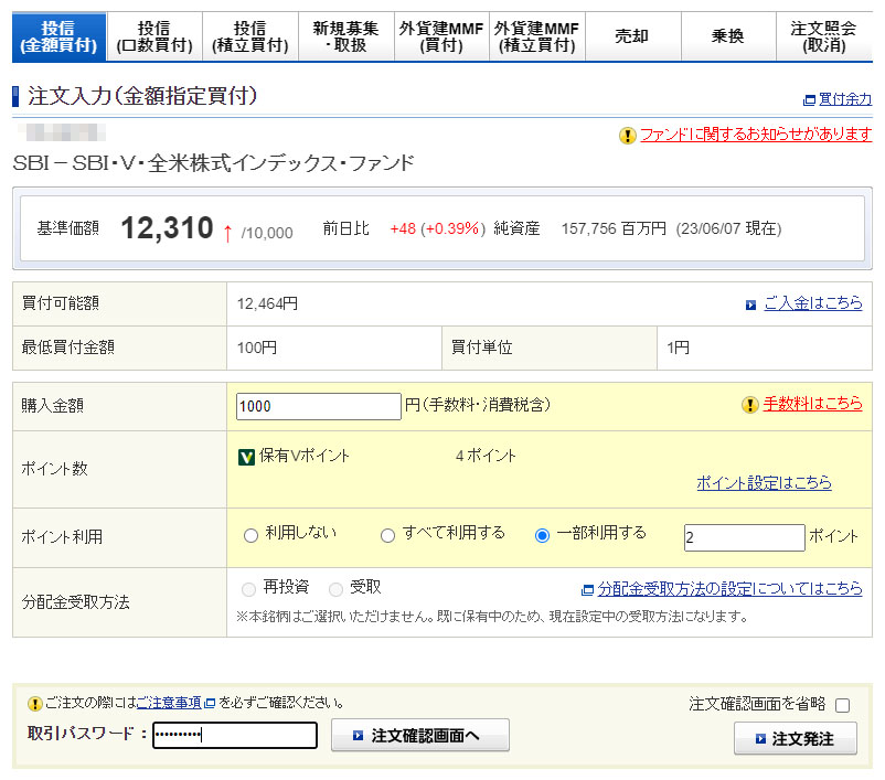 Vポイントが入ったのでSBI・V・全米株式インデックスファンドを1,000円分追加|2023.6.8 またまた僅かにVポイントが入りました。 このポイントも毎月入ってきます。得られるポイント数に波があるのですが未だに何のポイントなのか?解っていませんw 計4ポイントの内、2ポイントを「SBI・V・全米株式インデックスファンド」に充てます。 現金持ち出しは「998円」でまぁほとんど現金ですw これなら積立した方が・・・。 今、早朝なので今日の扱いでやはり明日の約定。 実際、翌日だったり中一日だったりします。