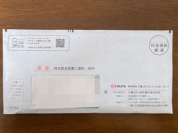 私が現有してる単元保有株銘柄では最後の通知、「三菱UFJフィナンシャルグループ」から「株主総会招集ご通知」が送られて来ました。これで一通り来たことになります。