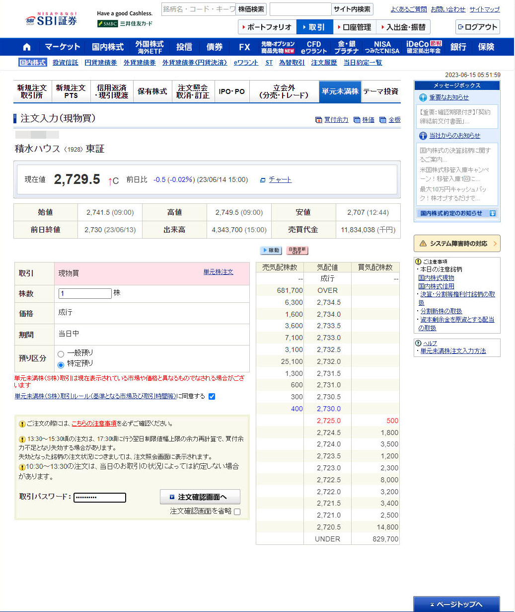 まぁ1株だし注文しました。昨日の終値は2,729.5円。注文時のPTSでは更に20円程下げていました。