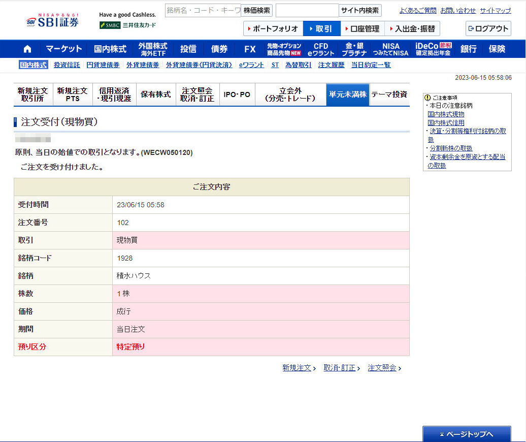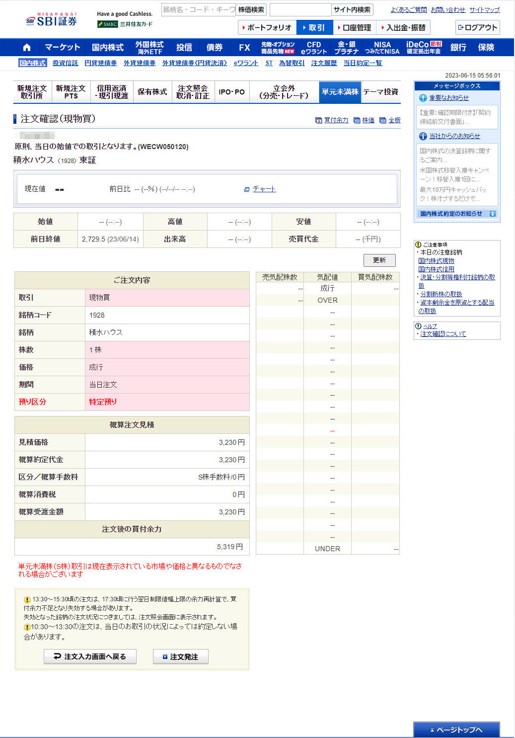 単元未満株なので「成行」注文。これって約定金額が分からないので少し怖い面もあります。特に寄り付きで大きく上げるなんてことはざらなので。。。