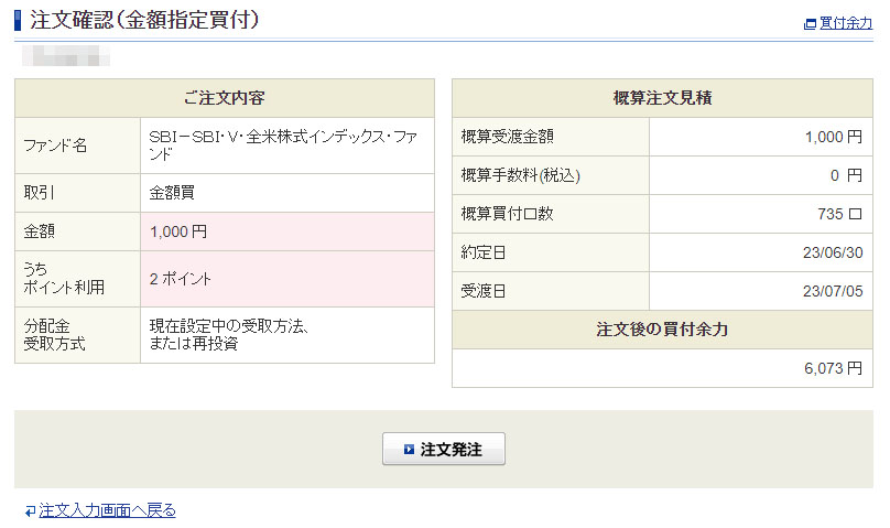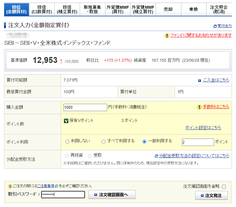Vポイントが入ったのでSBI・V・全米株式インデックスファンドを1,000円分追加|2023.6.29