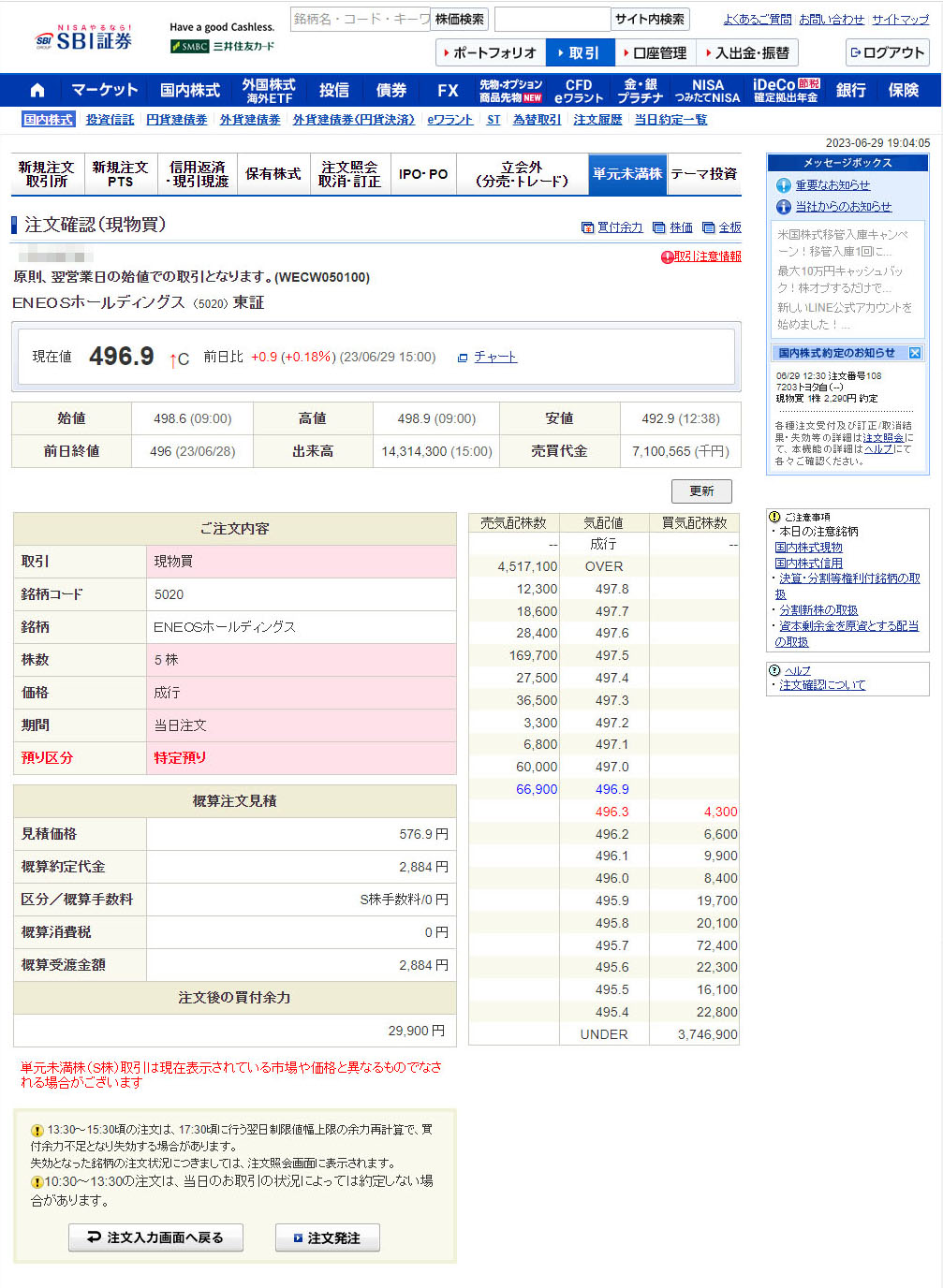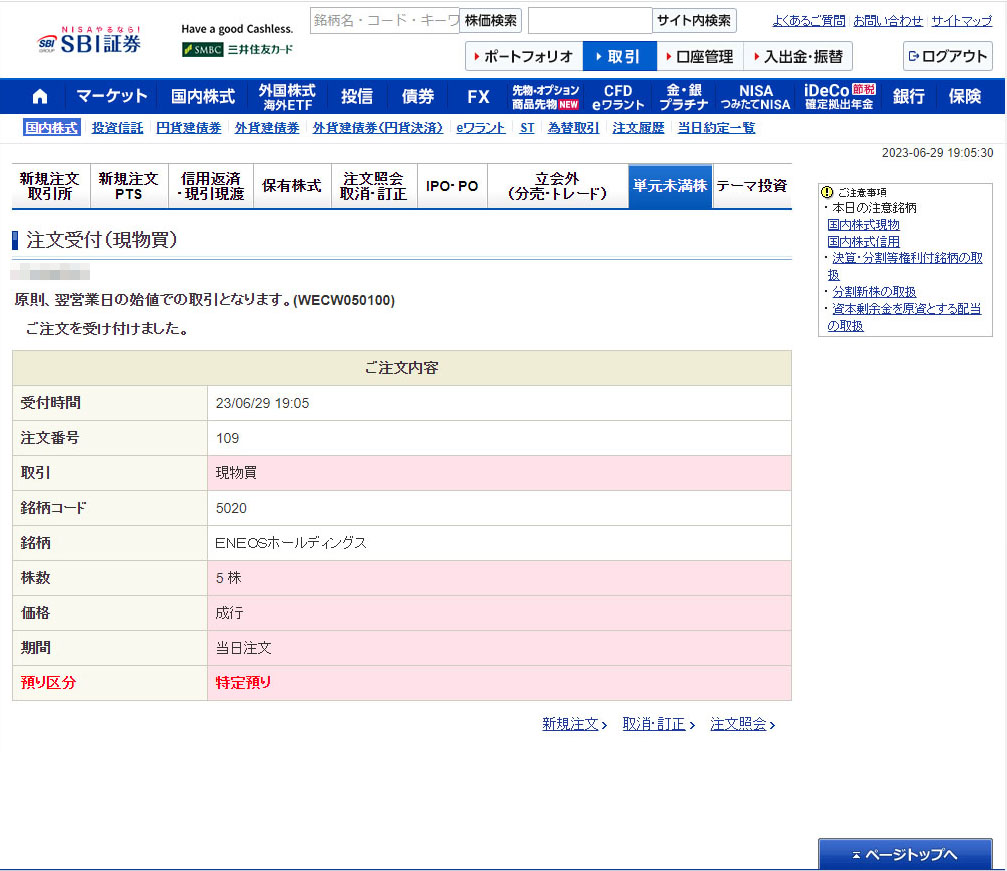 ENEOSホールディングスは9月末が権利日なのでそれまでにはこのSBI証券でチマチマ買っている単元未満株を100にして1単元にする予定です。