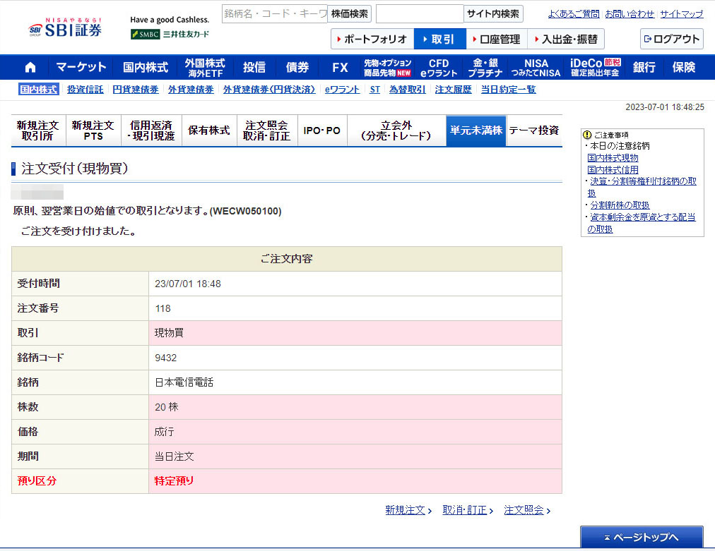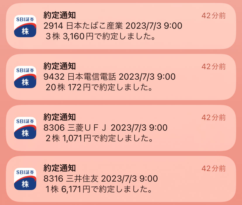 最後は単元未満で8株保有してた株が25分割で2単元(200株)になった「日本電信電話」を20株買って再び単元未満でもホールド。NTTは分割して非常に買いやすくなったのと、やはり今後はジワジワと上がるだろうと思いまして・・・。