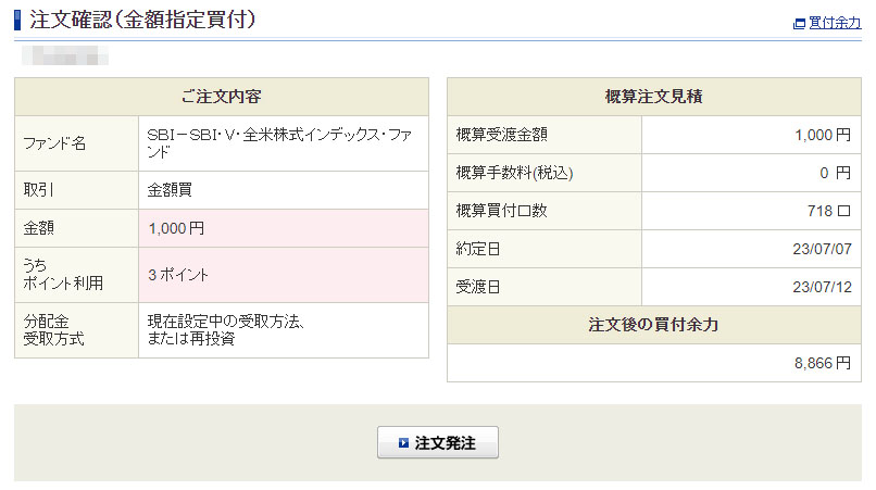 Vポイントが入ったのでSBI・V・全米株式インデックスファンドを1,000円分追加|2023.7.6 このところ何故か?Vポイントが入らなくなり久しぶりの入金です。 今回は「ダイレクトログイン」分。毎月入っていた「タッチ決済」分が今月は入りませんでした。。。何故かは不明。 入らないものは仕方ないので入ったら入金の何時ものパターン ポイントは5ポイント入ったので3ポイント分を「SBI・V・全米株式インデックスファンド」へ 口座からの持ち出しは997円 投信は個別銘柄に比べると地味です。ですが利幅は一番イイのかも? よく言われる事ですが素人の個人投資家はインデックスに積み立て弄らないのが一番利益を出す方法かも?www