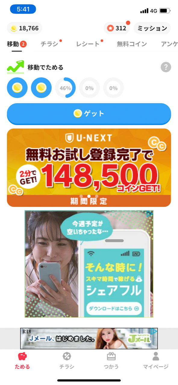 移動で貯める=歩いた歩数に応じて5個プールでき1個づつ動画が再生されてコインをゲットする感じ。移動の他にも「チラシ」と「レシート」「ミッション」「アンケート」などあります。