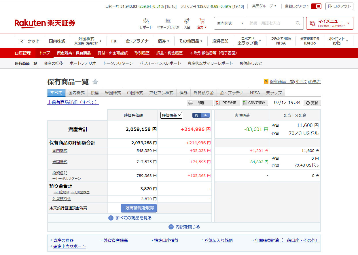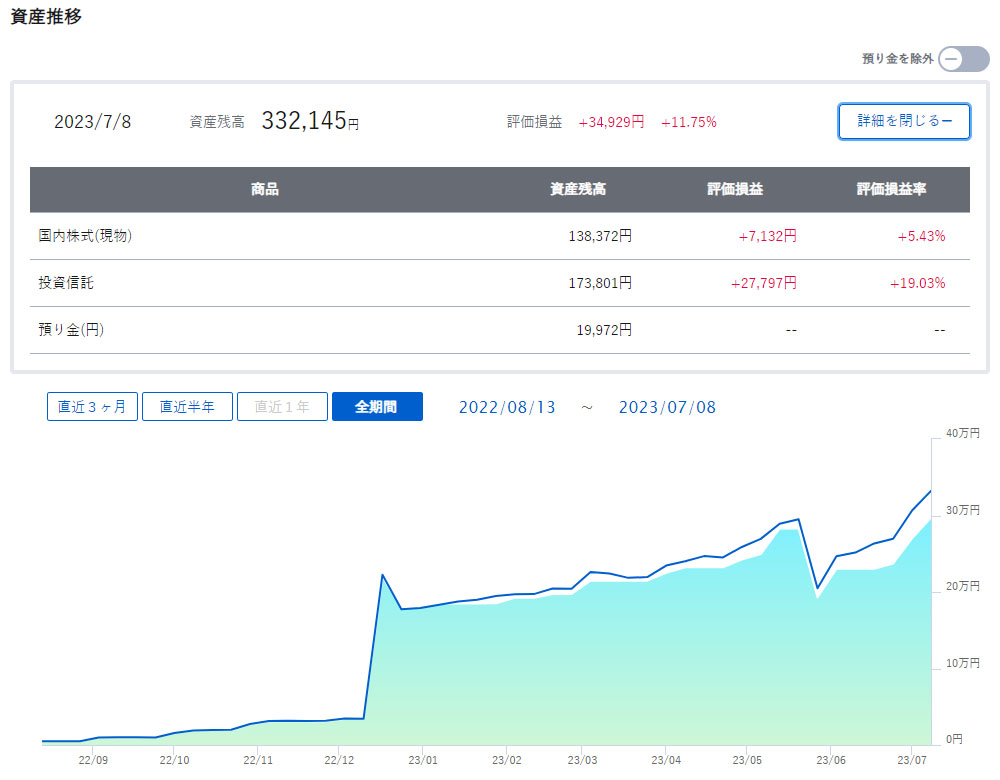 ここ3~4日は株式市況も調整に入り続落中ですが下げ幅はあまり大きくないので先月より評価益は出ていて、楽天証券分だけで20万円を超えています。