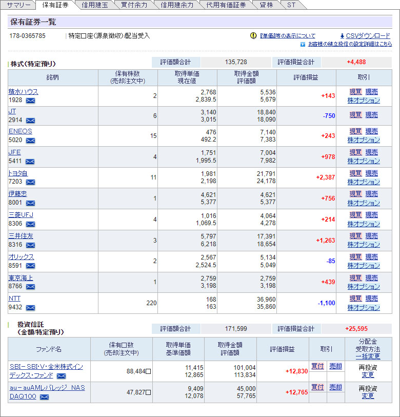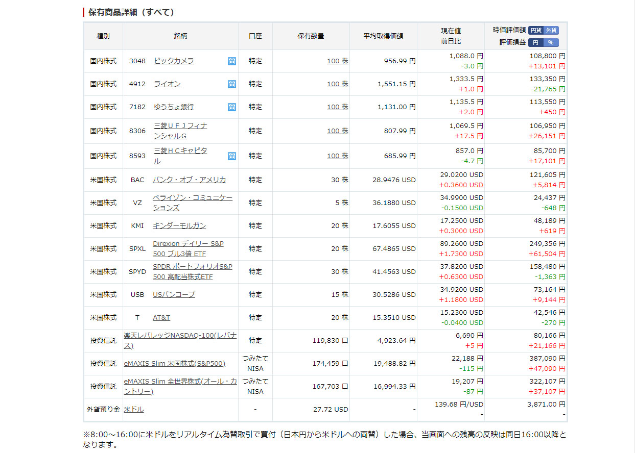 全体的な印象はあまり変わらずでライオン以外の銘柄がやや上がって三菱UFJは上げ幅が大きかった。投資信託もコンスタントに含み益が増えてる感じです。
