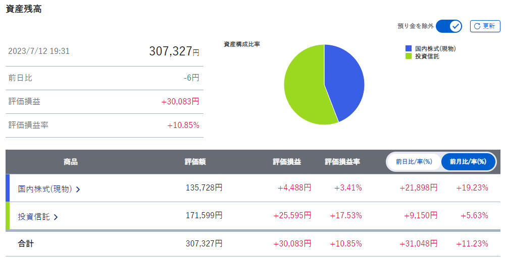 ポートフォリオもほとんど変わってない割合での投資。個別は買っていないので投資信託が増えたのみです。単元未満株の割合が増えてきた(それでも僅か全体の6%)ので別表にしました。
