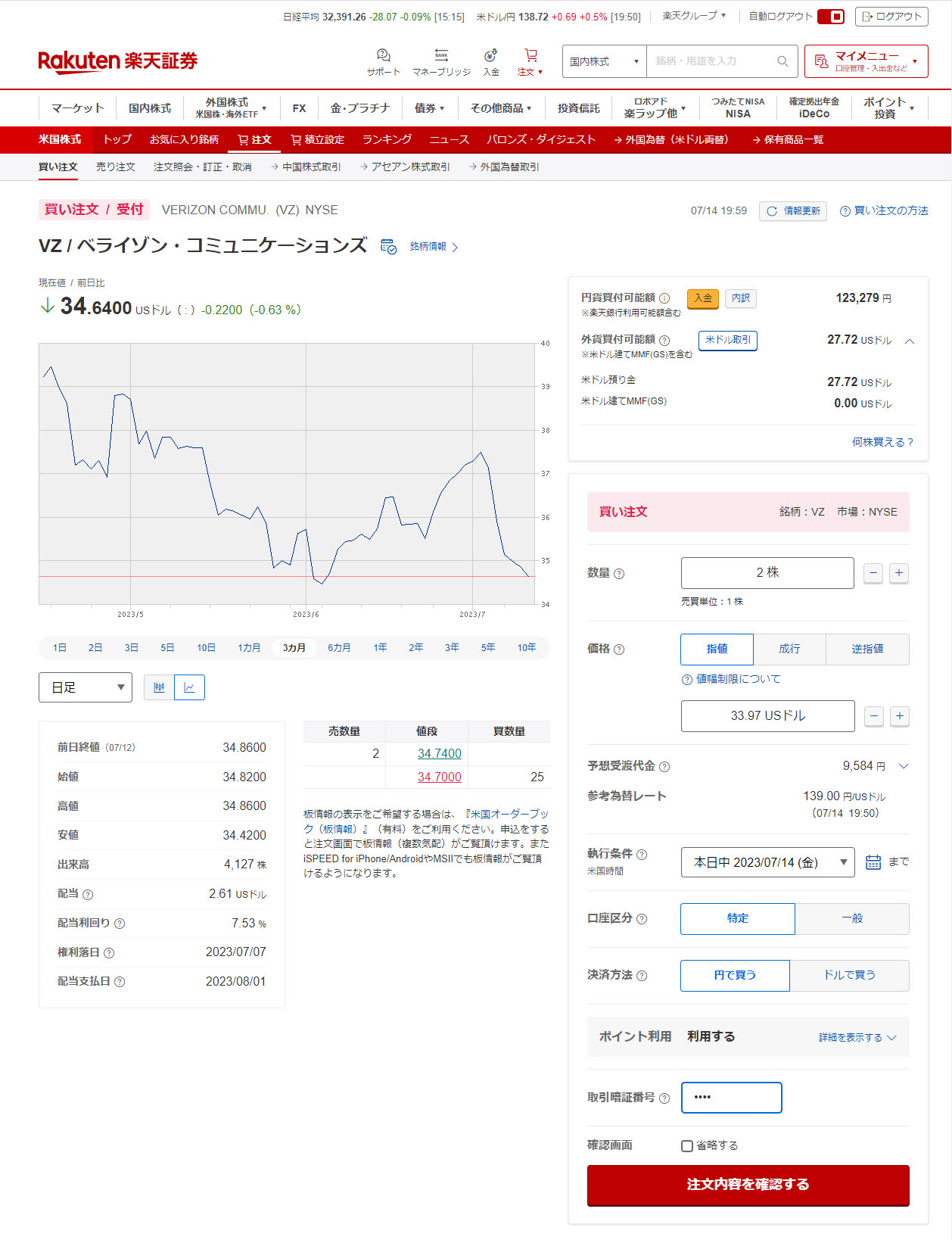 今回はまだ下がるとみて$34を割った$33.97で指値注文。5株買いたかったのですがまだ給料日までありますし・・・来週は少しお金も使う予定なので。。。