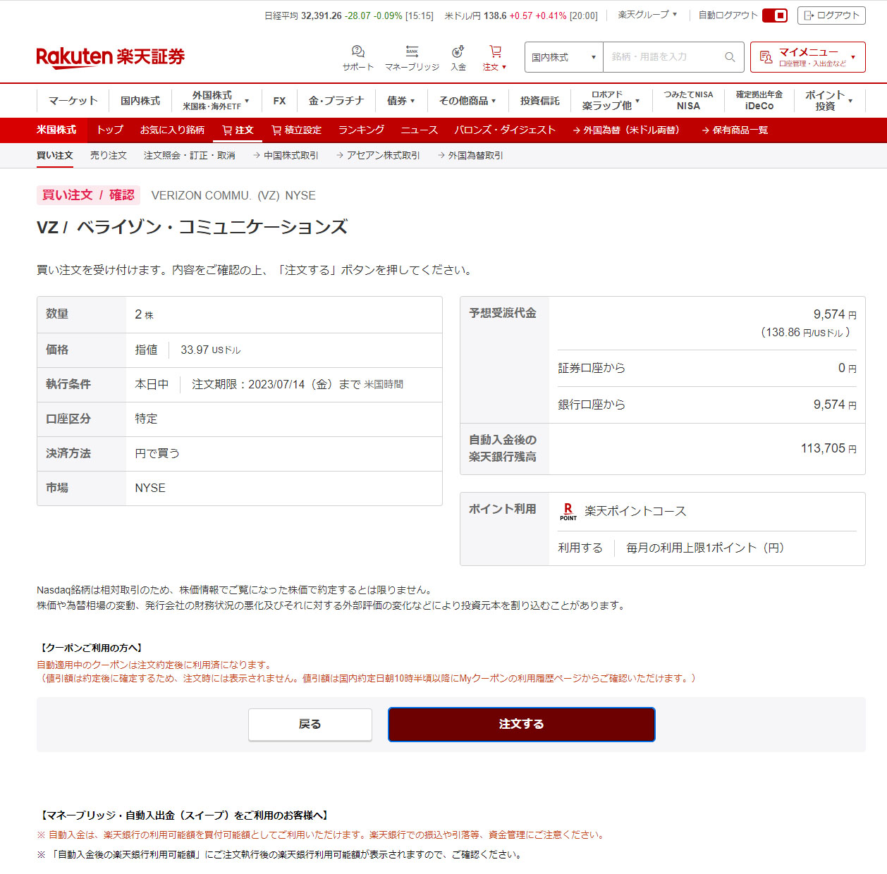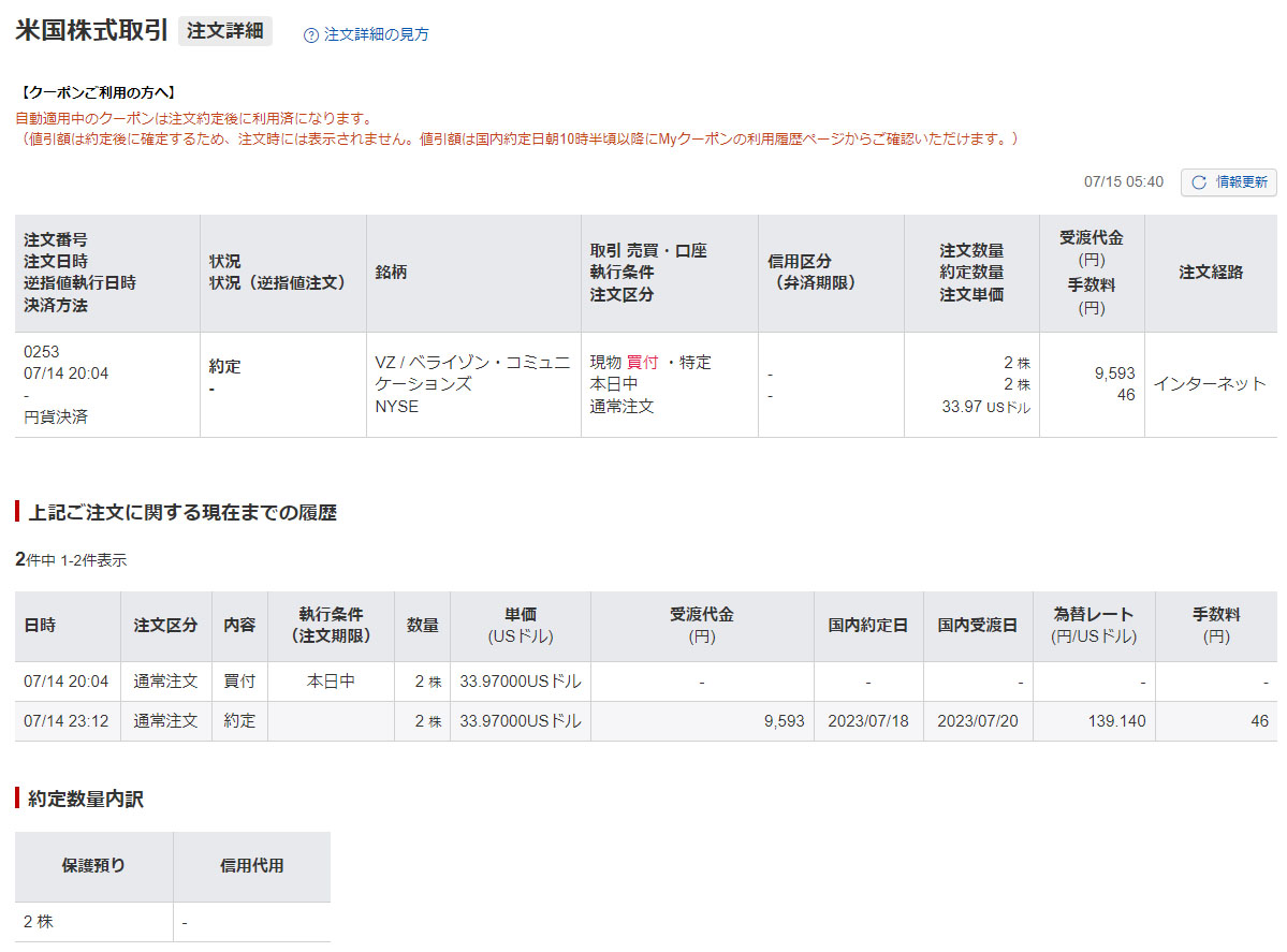 ここ2~3日、ベライゾンが下げ続けているので僅か2株ですが買い注文を入れました。
