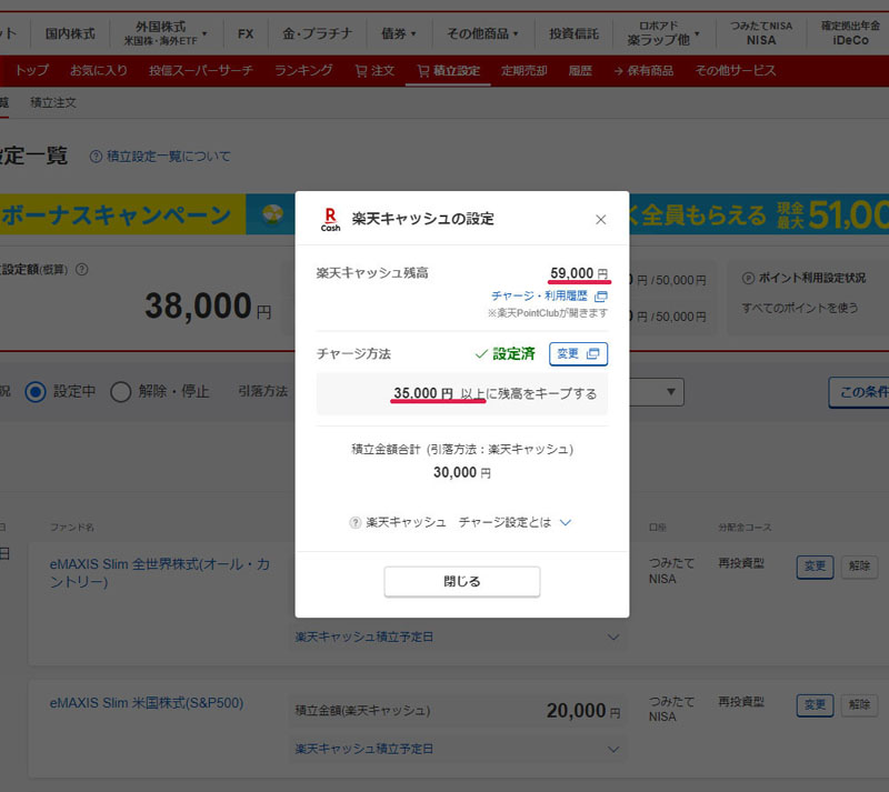 こちらの設定は「楽天キャッシュチャージ方法:設定済 確認」のところから変更できます。