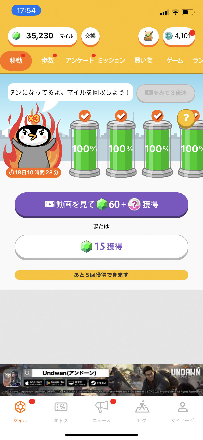 移動するとタンクが貯まっていきます。デフォではタンクは3個ですが貯めたマイルで最大10個まで増やすことが出来ます。私は既に10個なので上の画像では4個目が見えています。