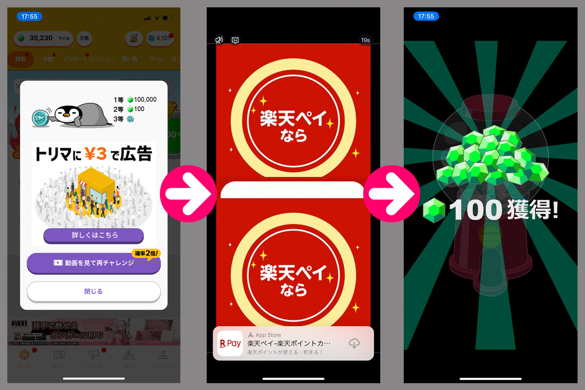 一度目のガチャで外れると「動画を見て再チャレンジ」をタップでさらに動画を見て終わると再びガチャがはじまります。当然、2回ともハズレが多いですが稀に当たる事もあります。私は2等の100マイルは何回も当たっています(体感ですが10回に1回は当たる)が1等の100,000は出たことはありません。2回目が外れてもコインが手に入ります。ですので自然とスロットを回せるだけコインが貯まることになります。
